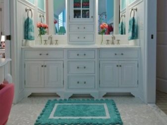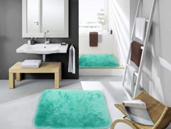 A small mat with a long nap is suitable for a bathroom. The best option is white snow plus turquoise. In the bathroom it is very easy to create a design in a nautical style, spending a minimum of effort. Bright material of the carpet product, curtain with a pattern in a maritime theme, a pair of wicker baskets will make the bathroom very stylish.