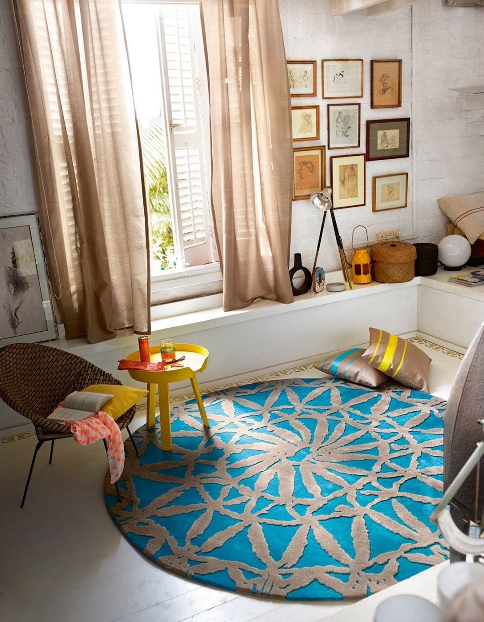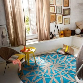 When choosing a turquoise carpet, pay attention to those turquoise elements of the room that already exist. It will be enough curtains, bedspreads or cushions.