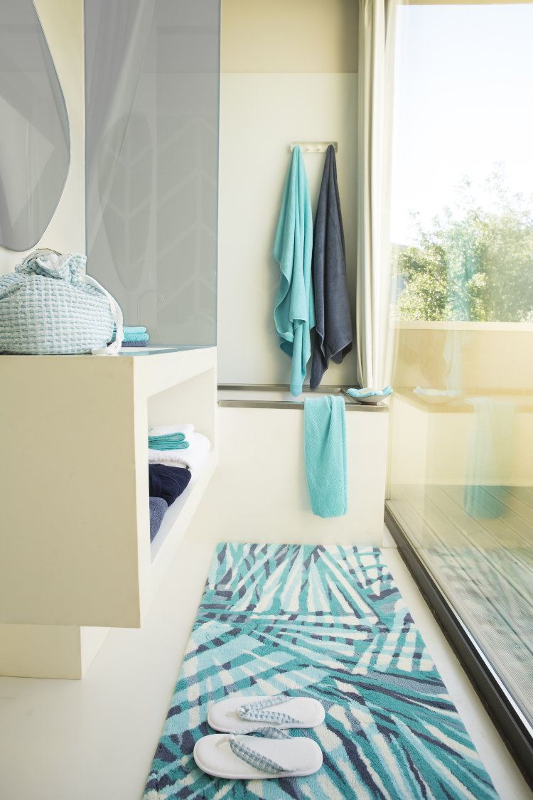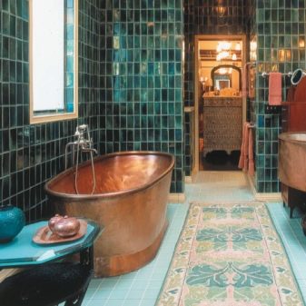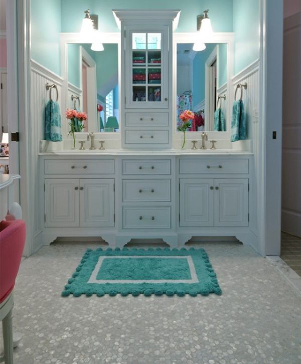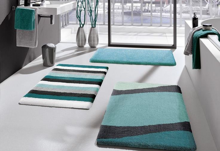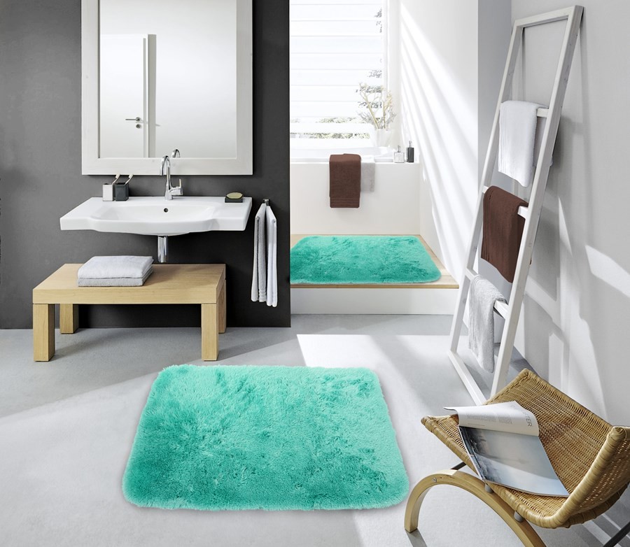 Gradient rug is also appropriate in the bathroom - white, slowly turning into a bright turquoise. The product looks very unusual. In the bathroom, do not be afraid of bright contrasts. Try combining lemon color with turquoise, blue with turquoise, green with turquoise. A bath is a place where people don't spend so much timeso here you can try the most interesting combinations.