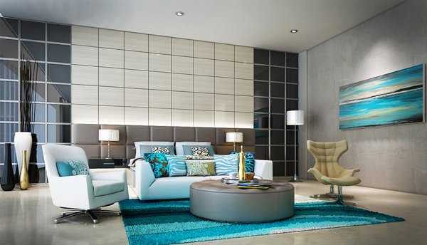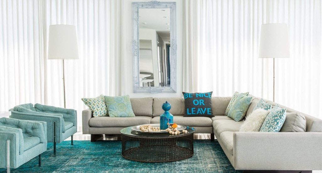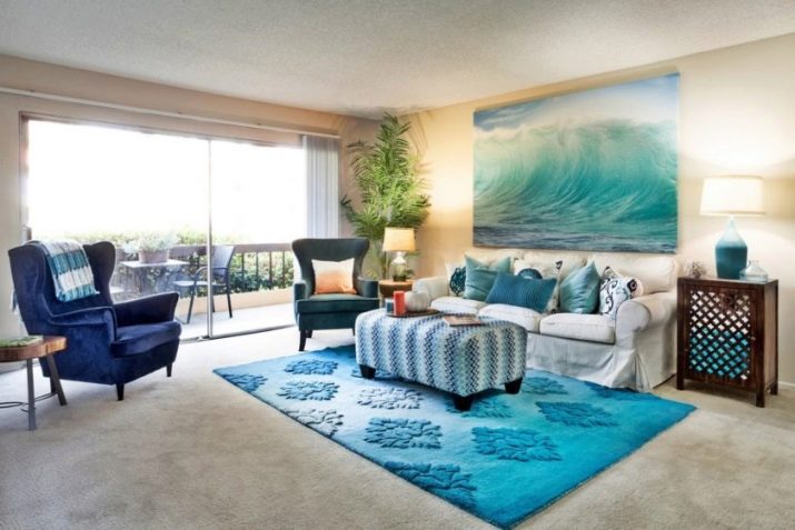 The answer is quite simple - you can use this shade everywhere. It can be a living room, bedroom, bathroom, nursery. The only feature is the use of a turquoise carpet in a spacious room. For a small and narrow room this color will not work., because it will "eat up" the space. Especially it concerns products with volumetric pattern or pattern. In a small space with such a product will constantly ruffle in the eyes.