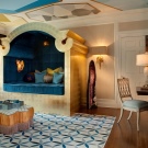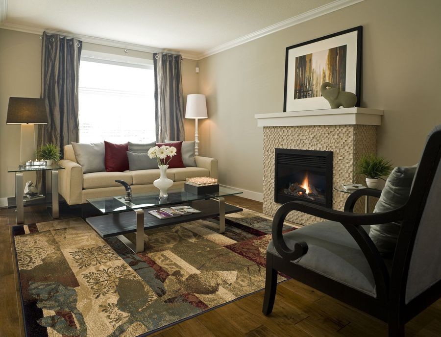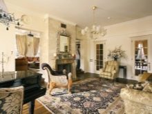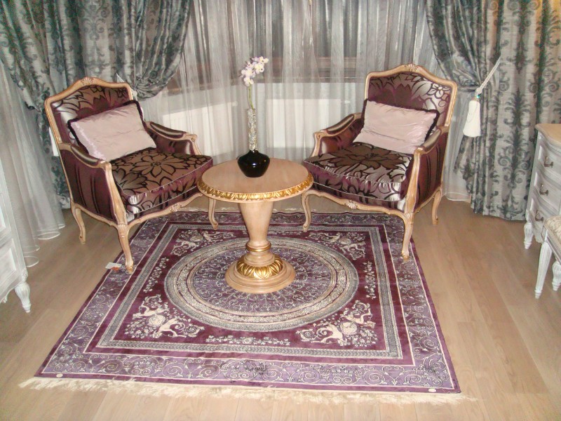 - Color range, size and shape must fit the style and blend harmoniously into the interior. Light colors and an asymmetrical diagonal pattern will help to visually enlarge the space. You can divide one large room into zones with the help of two or three small rugs.
