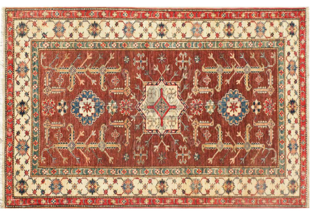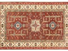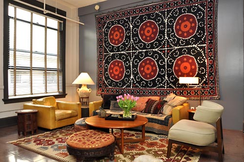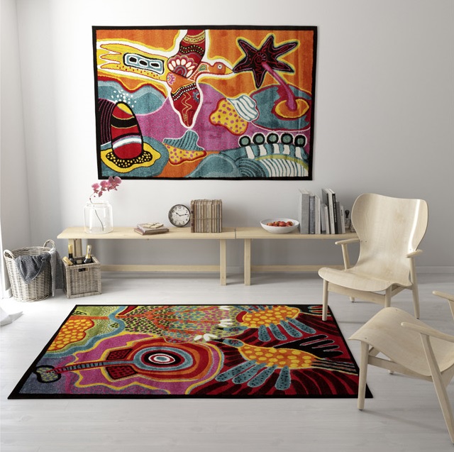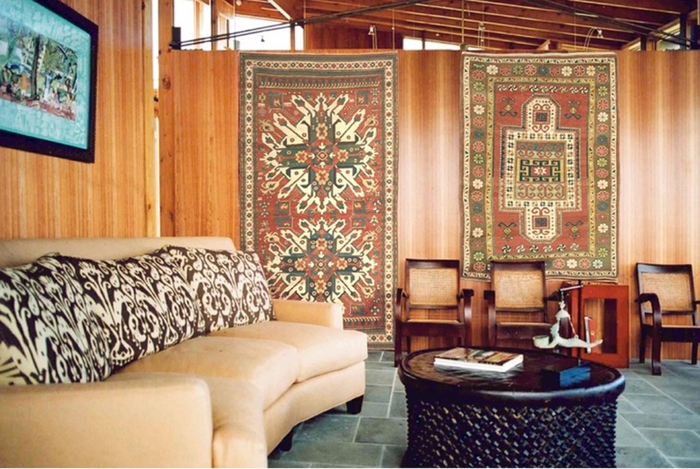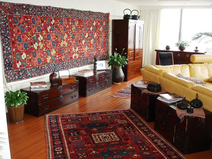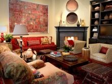 An ethno-style carpet will be appropriate in a room whose furnishings are made mostly of natural materials and not cluttered with furniture.