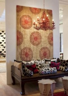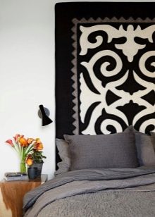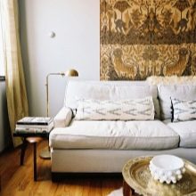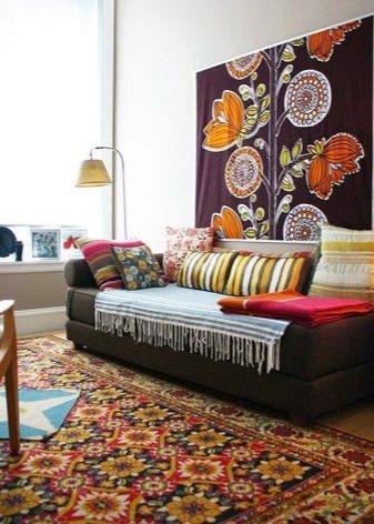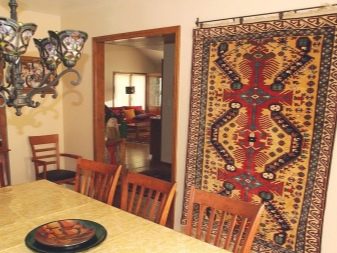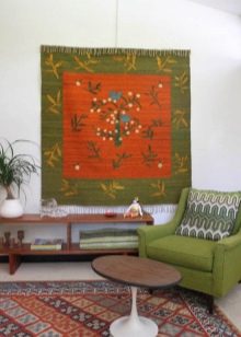 A very small wall carpet with small ornamentation, echoing the carpet on the floor, looks very expensive and stylish. The drawing of a wall carpet repeating the pattern of upholstered furniture adds space to the new lines. Bright and symmetrical pattern of the carpet in the living room will not make you bored in the most painful waiting.