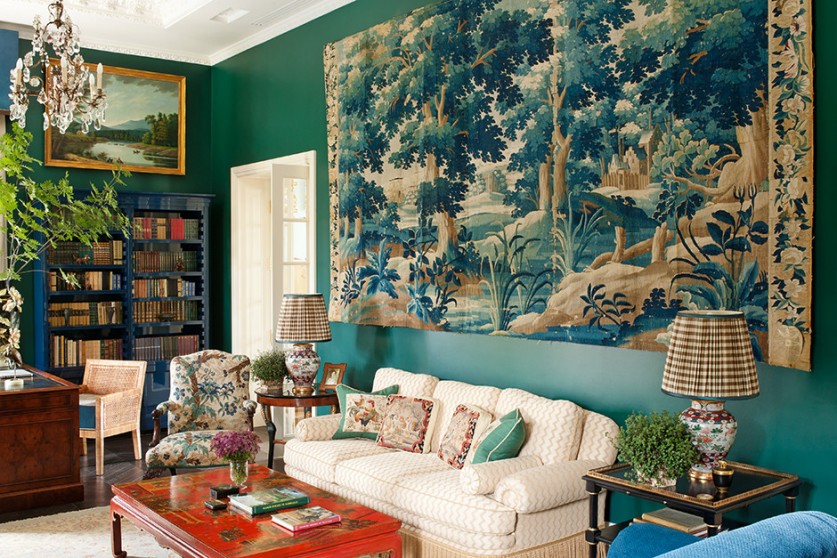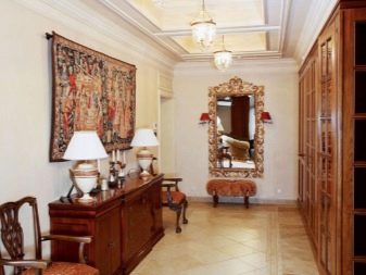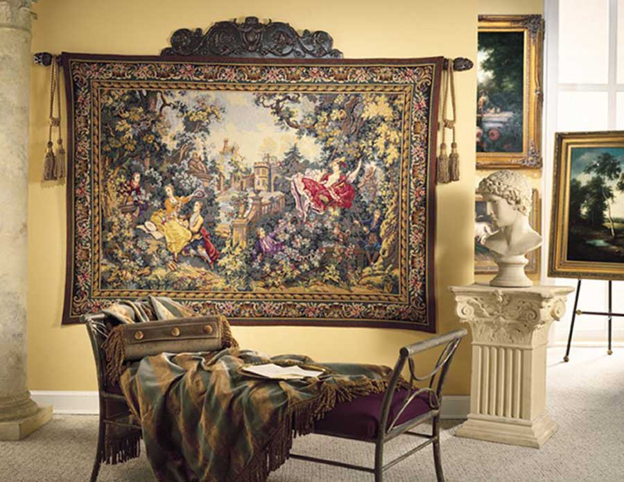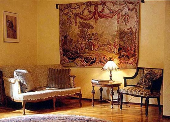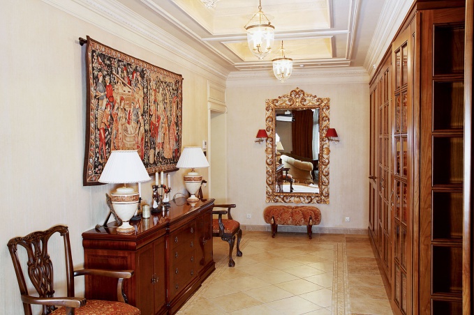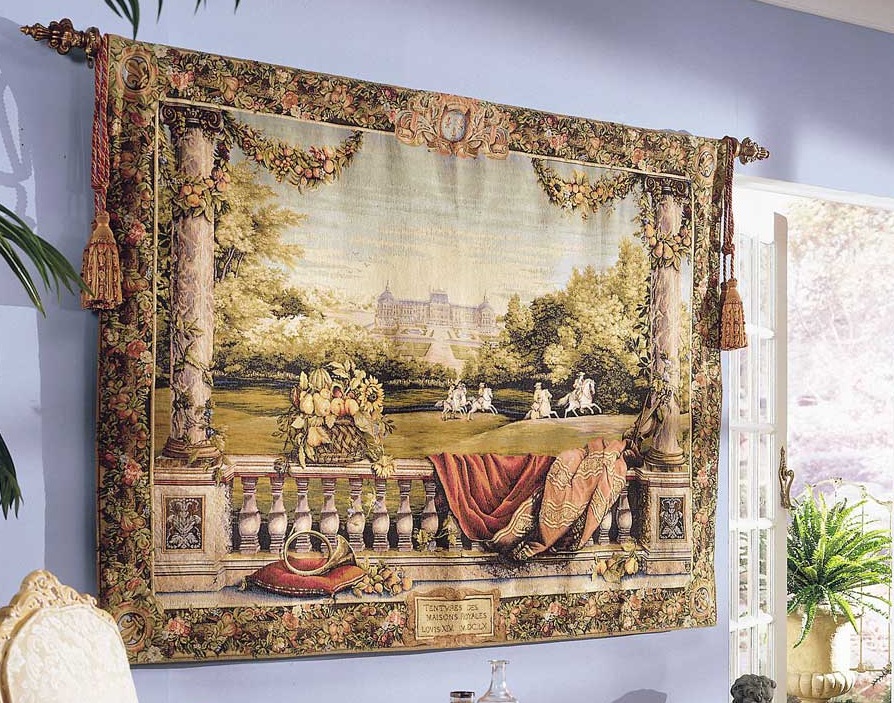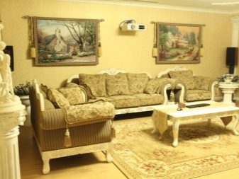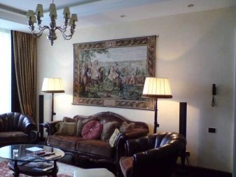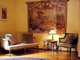 For classic style it is characteristic to place the carpet at the head of the furniture (sofa, bed). Classic means a tapestry with a landscape, animals or monophonic option. When choosing a monochrome tapestry, consider the color of the walls and choose a contrasting object.