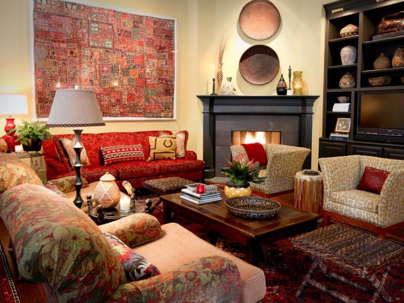 Apartment decoration in Indian style Suitable for those who do not like standards and stereotypes. This style is characterized by an abundance of pillows on the sofa and on the floor, carpeted on the wall in motley colors.