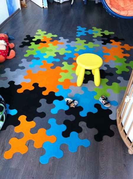 Carpet from puzzles is used not only for children's audiences. Such coverage is found in the gym, on playgrounds, sometimes in living rooms and bedrooms for adults. Modular designs have notches and gaps that are ideally suited to each other, so the assembled carpet is perfectly flat. It can be used in almost any room, it can be a bathroom or a kitchen. Due to the variety of colors and themes you can choose a mat for almost any interior.