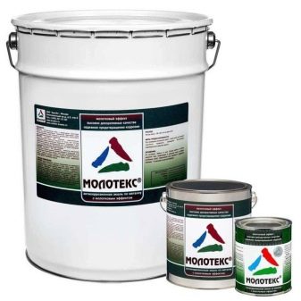 - "Moloteks". Firm Molotex produces paints with a hammer effect, having different colors. One of the most popular are the compositions of brown, gray, dark green, dark brown, dark blue and black colors.They can be applied not only on galvanized, aluminum or copper, but also on rusty surfaces. As a rule, consumers are satisfied with the use of Molotex hammer paint. They like not only the aesthetic appearance of branded coloring mixtures, but also their performance characteristics. In addition, the range of this manufacturer can be found relatively inexpensive paints.