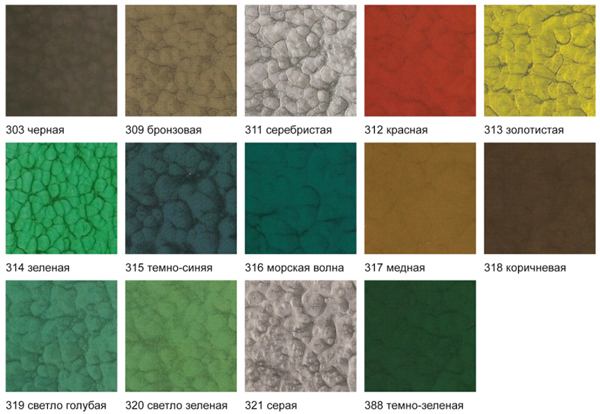 - It should be noted decorative properties of such paint. It is presented in a very rich color palette. Over time, the hammer mixture does not fade under the action of sunlight.