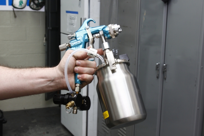 - Pneumatic sprayer. For finishing more large-scale and impressive areas ideal pneumatic spray.However, for such devices it is necessary to select colors of a suitable consistency. In accordance with the instructions, the hammer paint in the powder is diluted in a ratio of 2 to 1. To achieve the proper decorative effect, experts recommend applying a “zero” layer on the substrate. It is a very thin coating that should be kept for 1-2 minutes. With the further formation of subsequent layers, the starting layer will become thicker.
