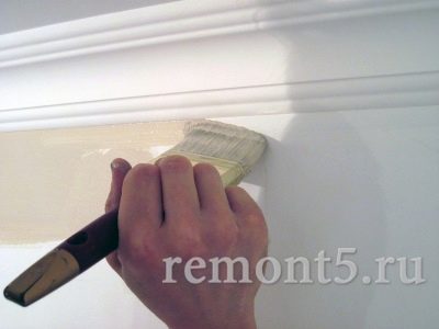 With the painting of corners and joints, the entire responsible dyeing process should begin.. And the first corner most distant from the doorway is decorated first. At this stage there is nothing difficult: you need to take a flat brush, dip it in paint in half (it is more convenient if the paint is poured from a common container into a separate paint container), wring out and start painting with light movements.