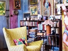 - Boho This is a style of intense colors, energy, eastern trends and western bohemia.English chair, made in tones that match the style, will fit into the interior and emphasize its character. For example, an orange chair with ears bright spot decorate the room in the style of boho.