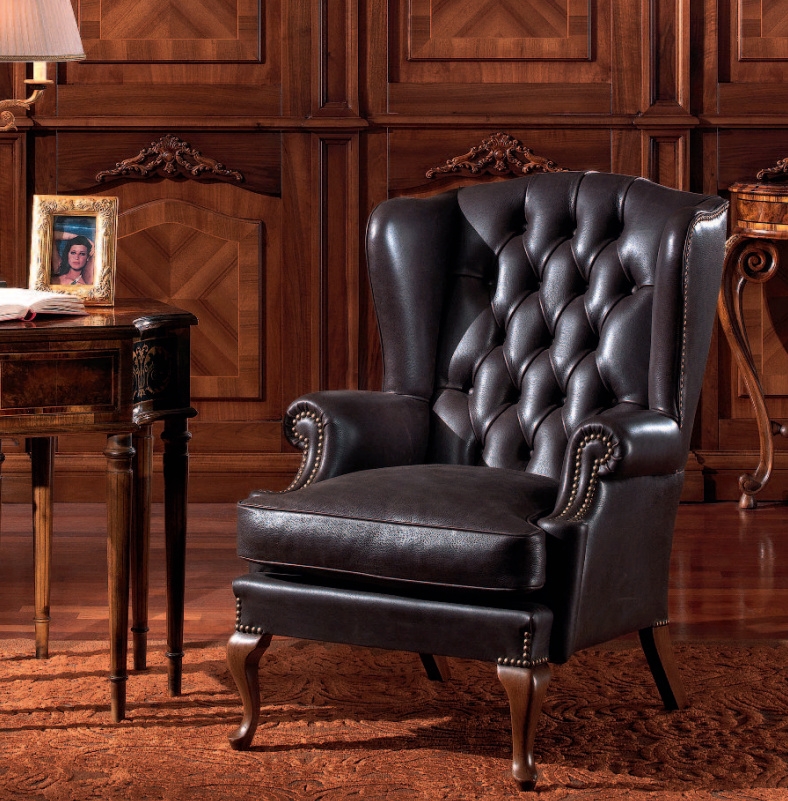 Traditionally, the Voltaire chair with ears is designed to relax by the fireplace, and therefore, the study or home library will be the ideal place for its purpose. It is there that the leather chair with ears will give the atmosphere a look of respectability and thoroughness. In addition to their decorative qualities, English chairs have the convenience of design, sitting in such a chair is comfortable doing intellectual work, writing, reading, and sometimes taking a nap, as the high back and ears of the chair hold the head securely.