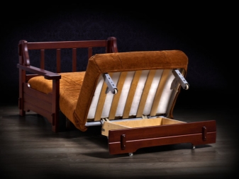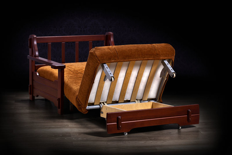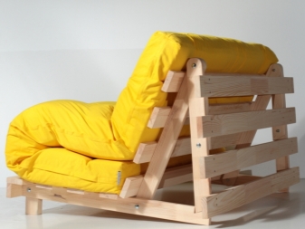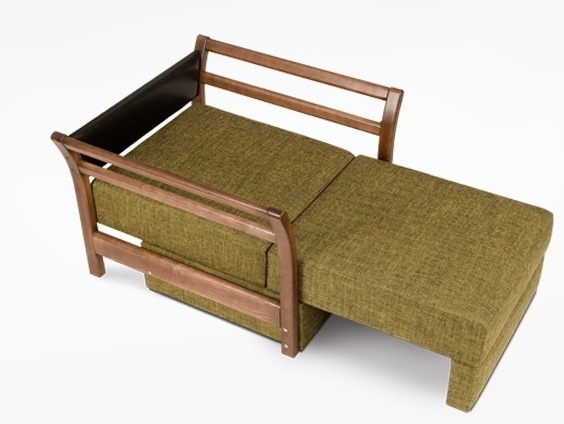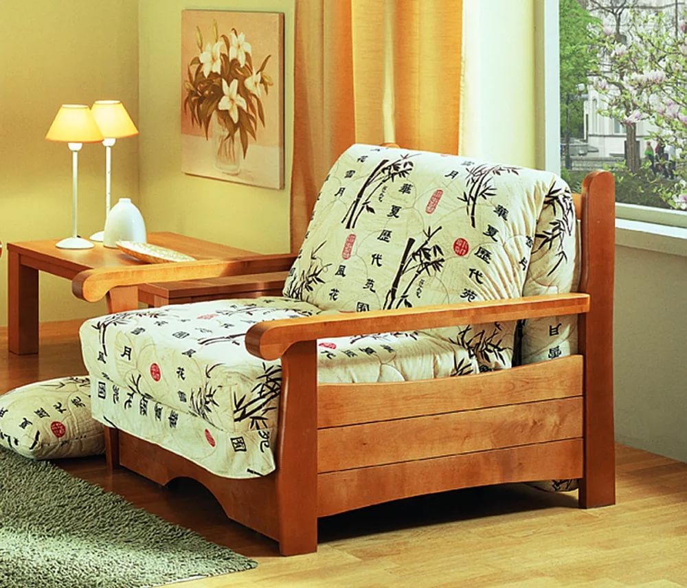 What can be said about the designs from a wooden bar. These models easily withstand the daily transformation from a chair to a bed and back, they are characterized by high durability, environmental friendliness and durability, and thanks to the impregnation of wood with special compositions, the wooden frame becomes moisture resistant and is not susceptible to the formation of mold.