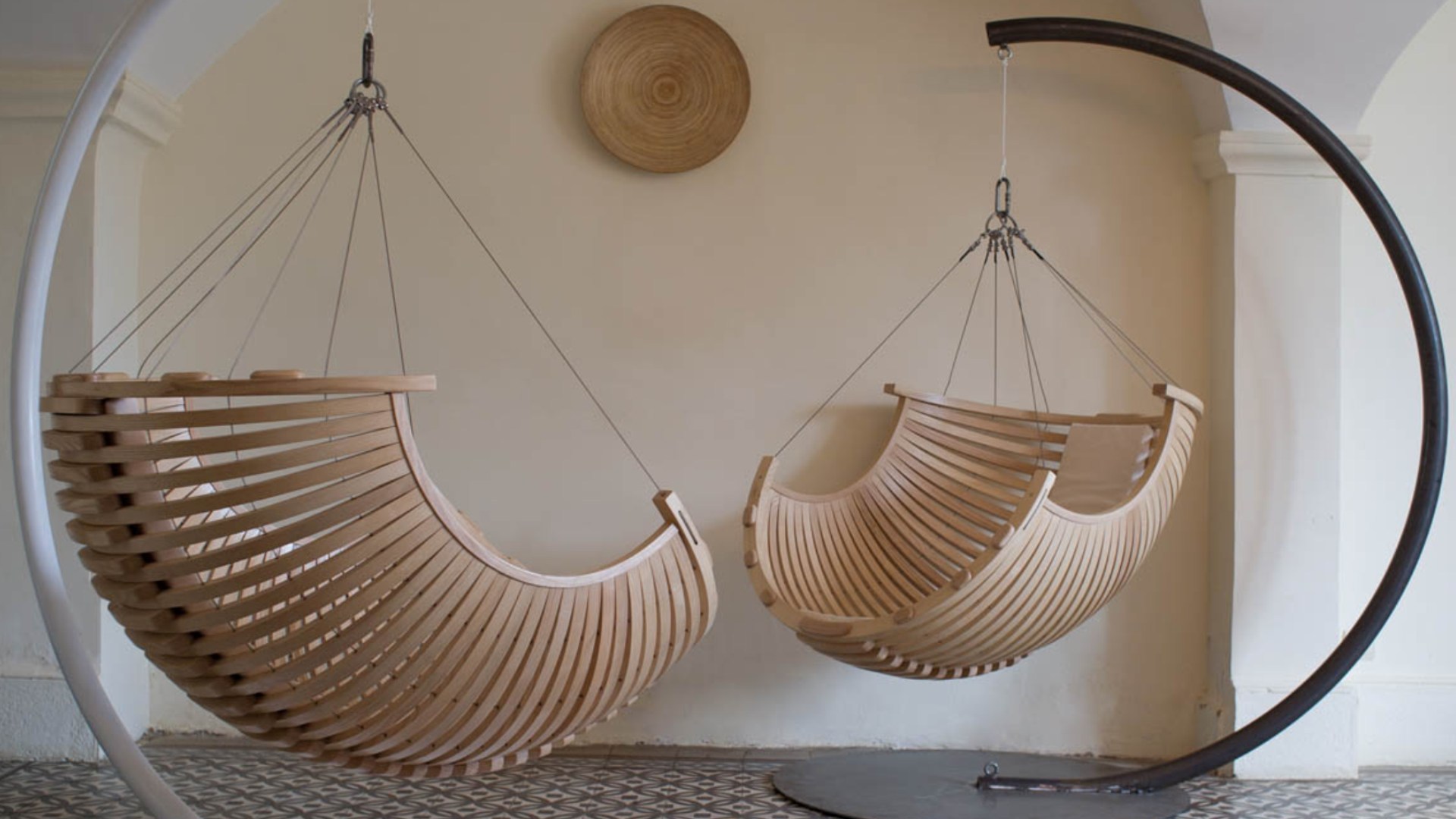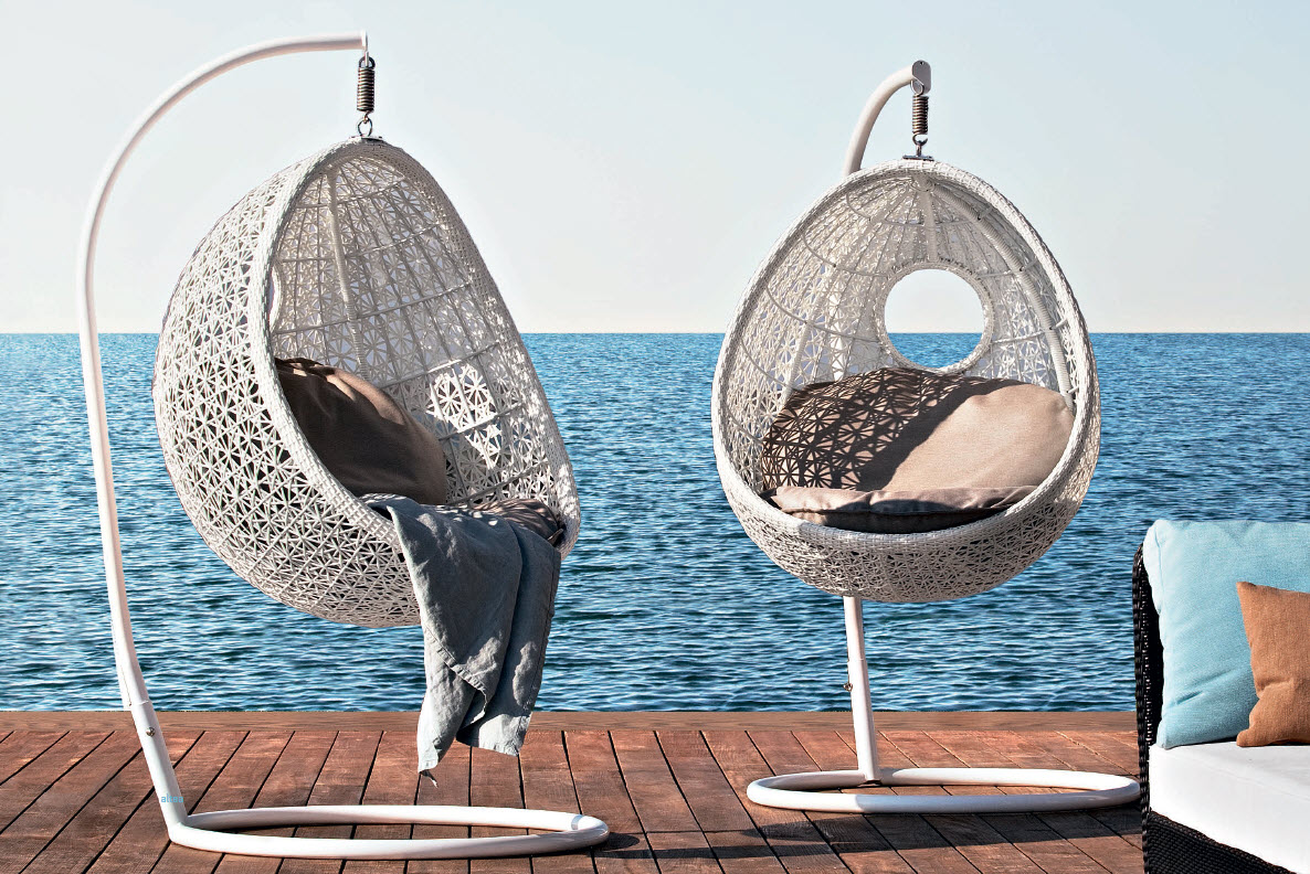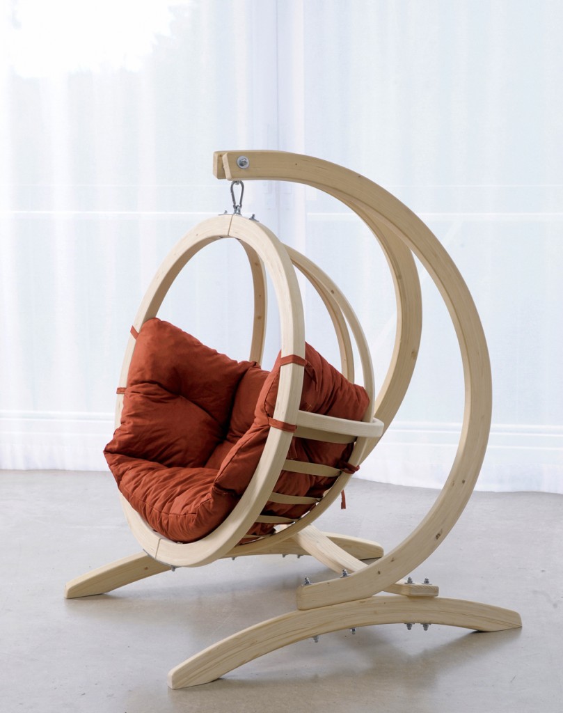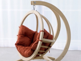In order to eliminate these drawbacks, hanging chairs on the rack were invented. They have the same unusual appearance, but at the same time they are completely mobile and do not require the installation of complex ceiling mounts. You can move this type of furniture when needed.