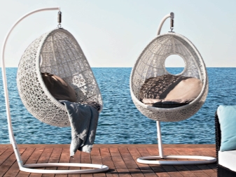 Suspended chairs are usually round. Often they are made of wicker or rattan - such furniture looks very stylish, and the naturalness of materials gives it coziness. Rattan, by the way, is also artificial, and it is very difficult to distinguish them by their appearance, so you can safely choose the material that suits you most at cost.