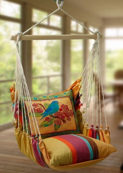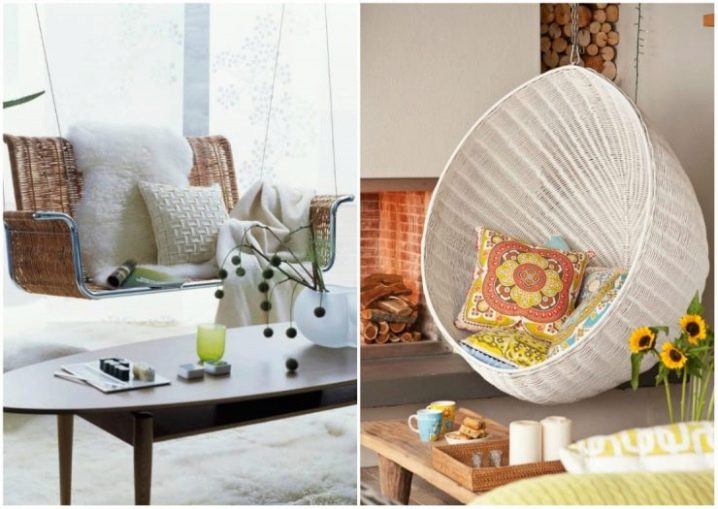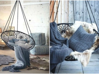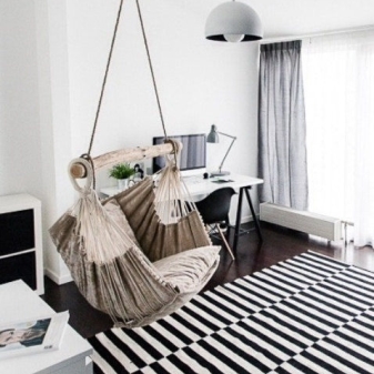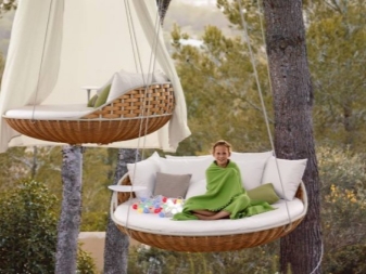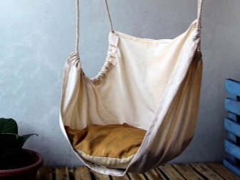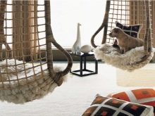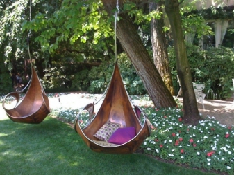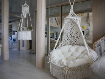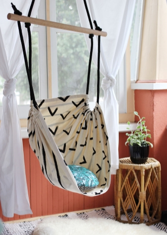 These unusual chairs can be made from different materials. The design itself is light and reliable, and most importantly, it can have both a soft and a solid base. A swing can be decorated with a cottage, sleeping area, children's room, attic or playground. Her strength to make their own, using durable ropes and thick textiles.