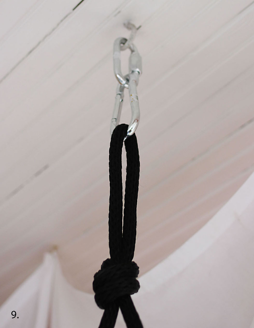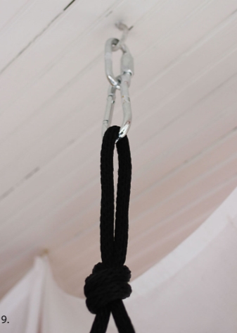 - Attach two carbine hooks to the ceiling hook, in the lower carabiner it is necessary to pass a cord. Thus, the design will gain sufficient strength for safe swinging in the chair.