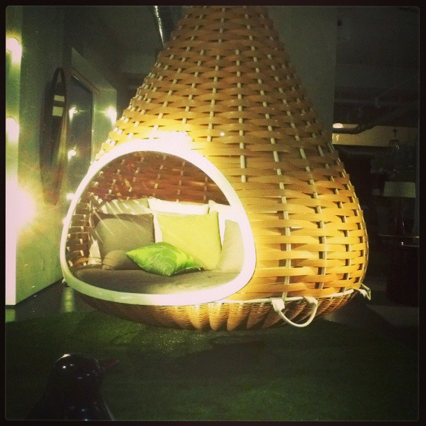 This model is interesting in that its production will require only an iron hoop, which must be braided with strong yarn. The construction itself must be hung from the ceiling with strong ropes. The nest can fit in any room, even in a small room.