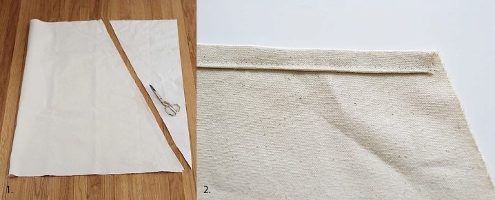 - First you need to take a cloth, fold in half, measure 18 cm from the top corner and draw a diagonal to the bottom right corner. The result is an uneven triangle that needs to be cut and removed. The main part of the fabric needs to be unfolded and stitched the sides of the cut, picking up their edges per centimeter.