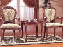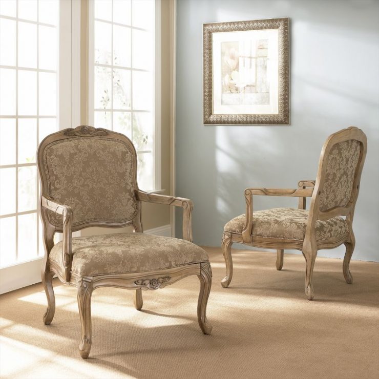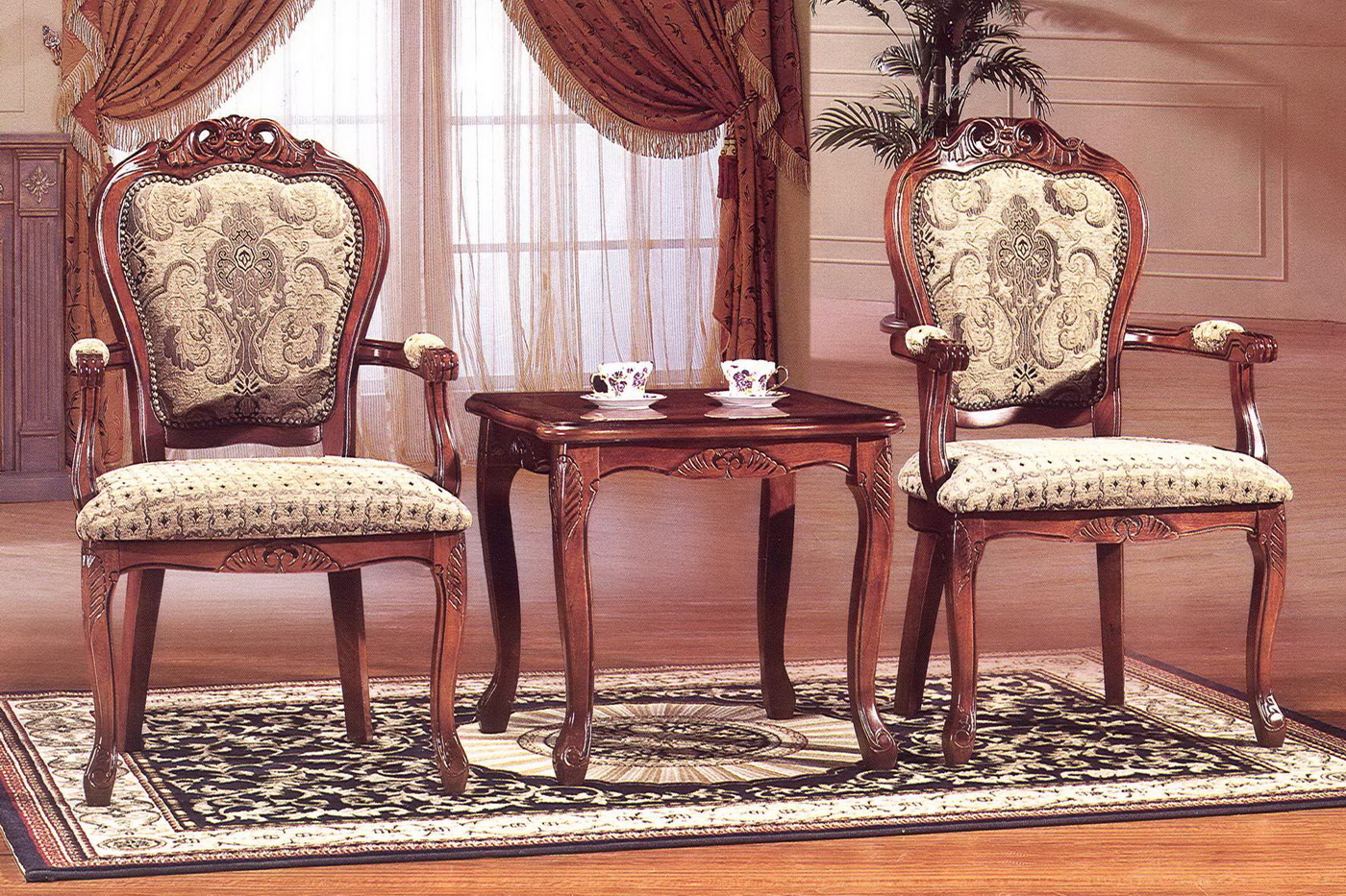 Elite peach wood chairs with carved edging gold upholstery will look gorgeous in a room of neutral colors.