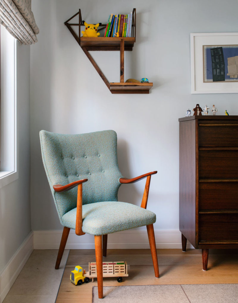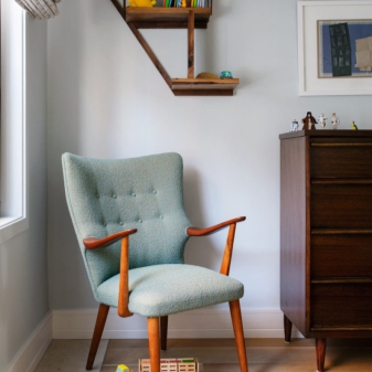 - In a separate category, you can make children's chairs with comfortable armrests.These options are also often equipped with small wheels and differ from classic home or office products in a softer seat and a positive color scheme, which looks great in a nursery room.