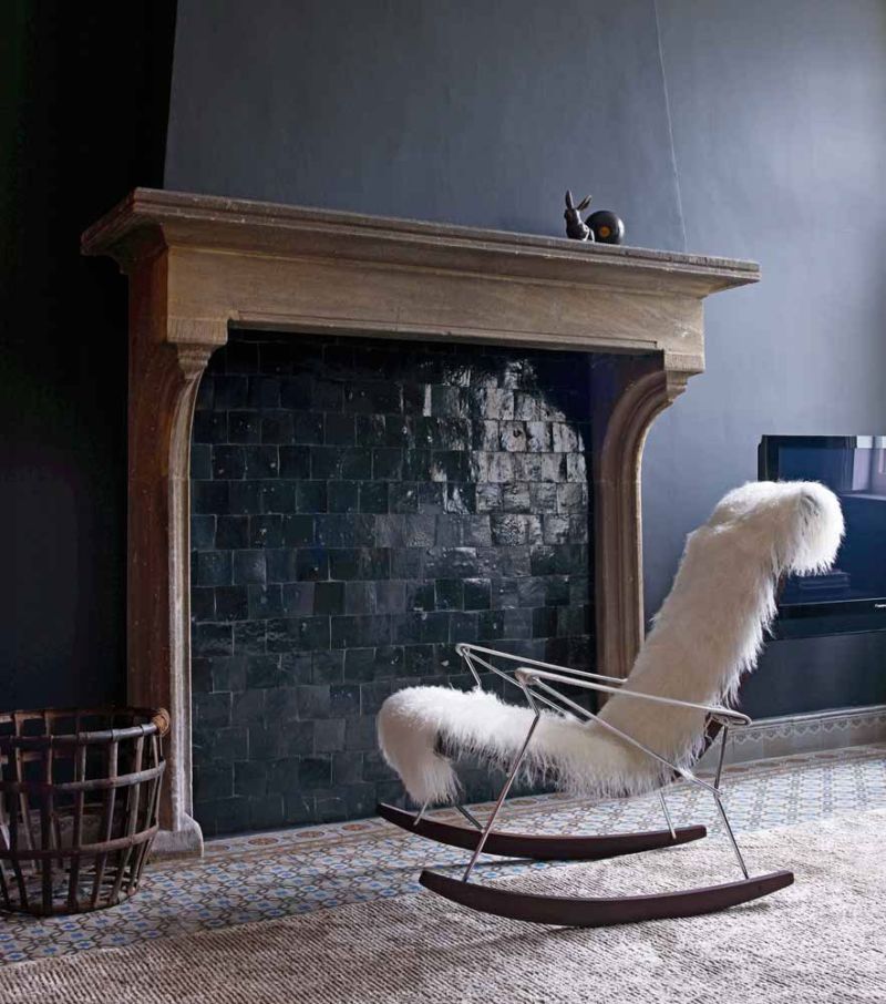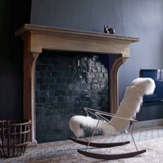 A rocking chair made of dark wood with metal legs and armrests can be placed near a good fireplace in a dark room.Add such furniture with a fluffy white cover.