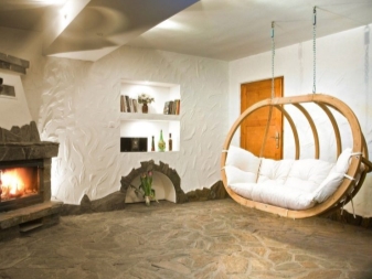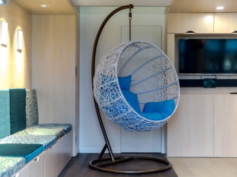 Chair models attached to the ceiling have high durability. The spectacular hanging egg chair is attached with a reinforced hook to the ceiling beam. The design is compact, does not take up much space. True, an art object with such an attachment cannot be moved to another room. Another disadvantage is the fact that far from all overlaps can meet safety standards. In such cases, it is better not to risk, and choose the option on the rack.