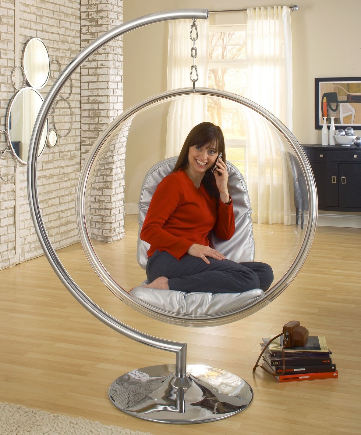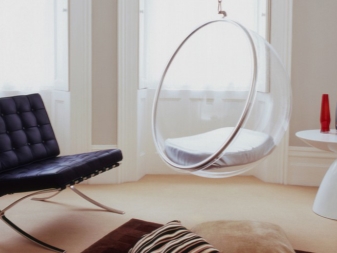 - Plastic, acrylic or plexiglass. Spectacular materials are also very common in the design of hanging chairs.With their help, you can create almost any, even the most extravagant form. For example, as a replica of the chair "Egg Chair". The material has remarkable strength, aesthetic, practical qualities. Such products are easy to clean.