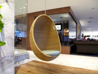 Hanging egg chair can decorate not only the living room. It is sometimes placed in a room for sleeping. With sufficient size of the bedroom, the model of the chair on the rack is installed in the corner of the room or by the window. The interior always looks great natural materials from which the art object is made: a rod or rattan. For convenience and beauty, you can put decorative pillows or a bright blanket on the seat.