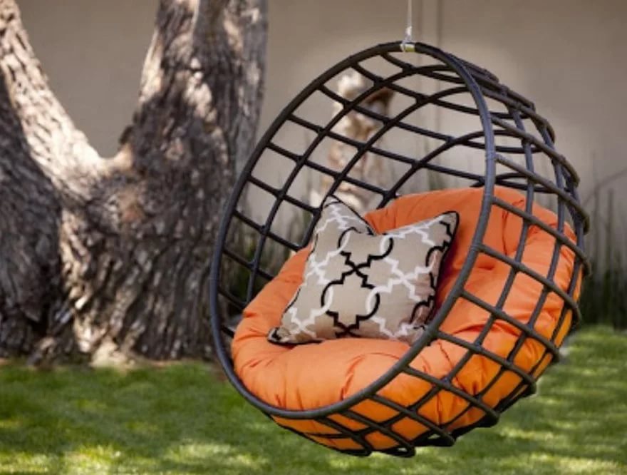 In a spacious room, you can always place an outdoor egg chair on the rack. The metal base smoothly passes into the bracket behind the seat in the shape of an arc. This design holds it, not giving much swing. This option is very mobile: you can move and install such chairs anywhere in an apartment or house, put it even on the street, and fold and take it with you when you move.