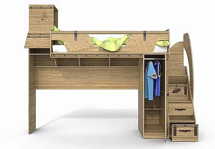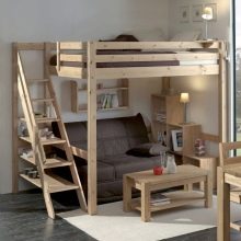 If the product is distinguished by its structural features, the following types can be distinguished: a single bed with a desk, a double bed with a sofa and a bed on the lower tier. Different products and material production. If it is made of wood, it is notable for its durability, durability, massiveness and high weight. Wood is an environmentally friendly material, so it is advisable to choose it. But natural wood costs a lot of money, which is some drawback.