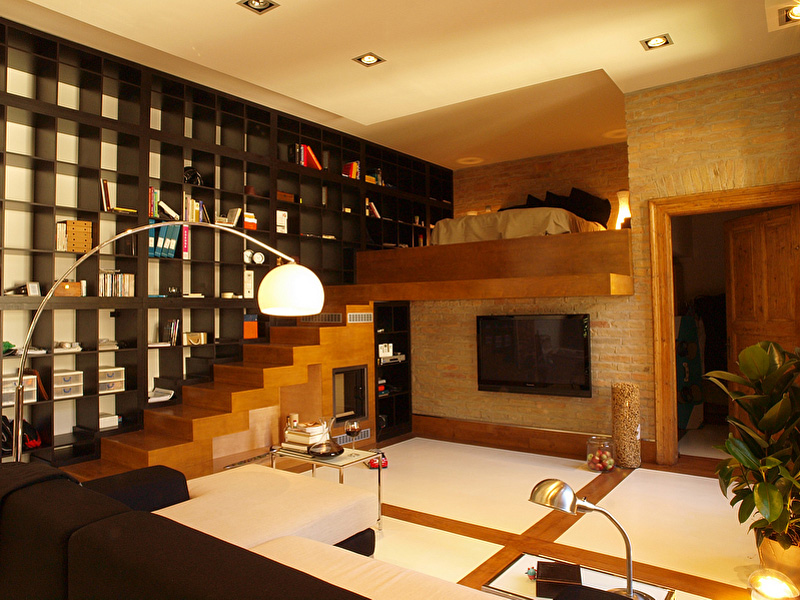 - The most practical option can be considered a staircase with a podium, which is a step with niches. On these shelves you can place small interior items, books and accessories. Choosing a loft bed, you need to focus on personal preferences, the size of the room and the number of tenants. By combining all the necessary qualities in the construction, it is possible to obtain an ideal construction in every sense.