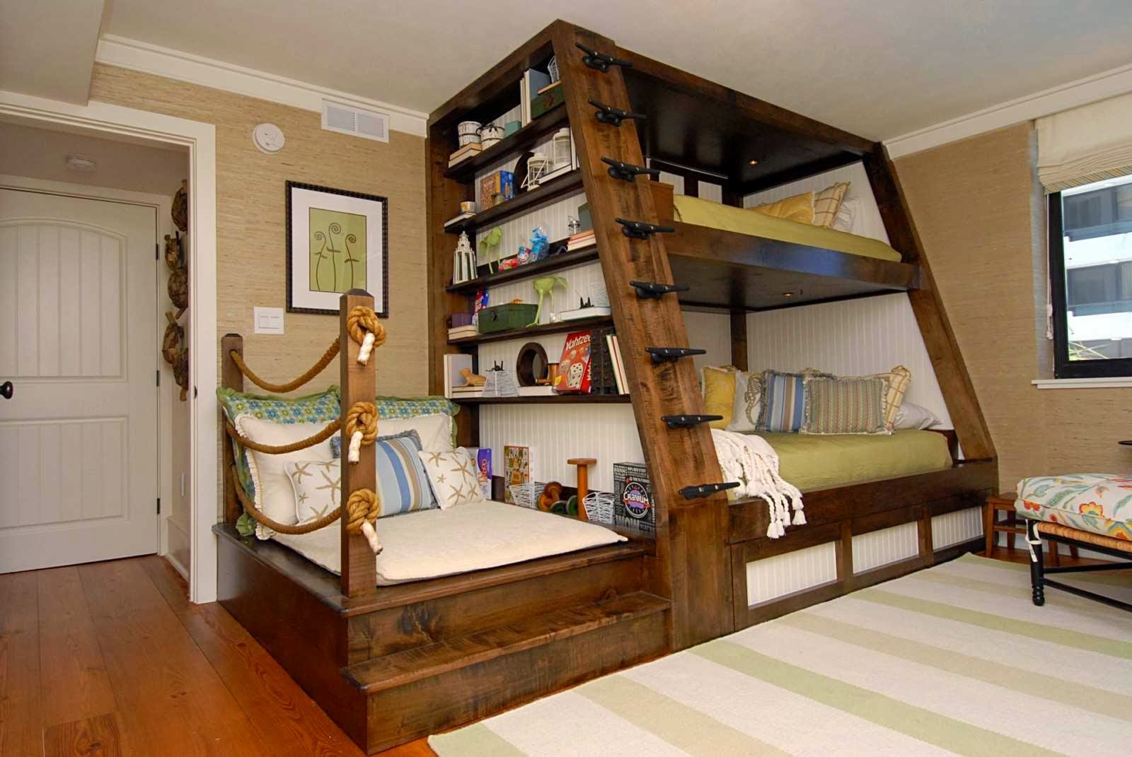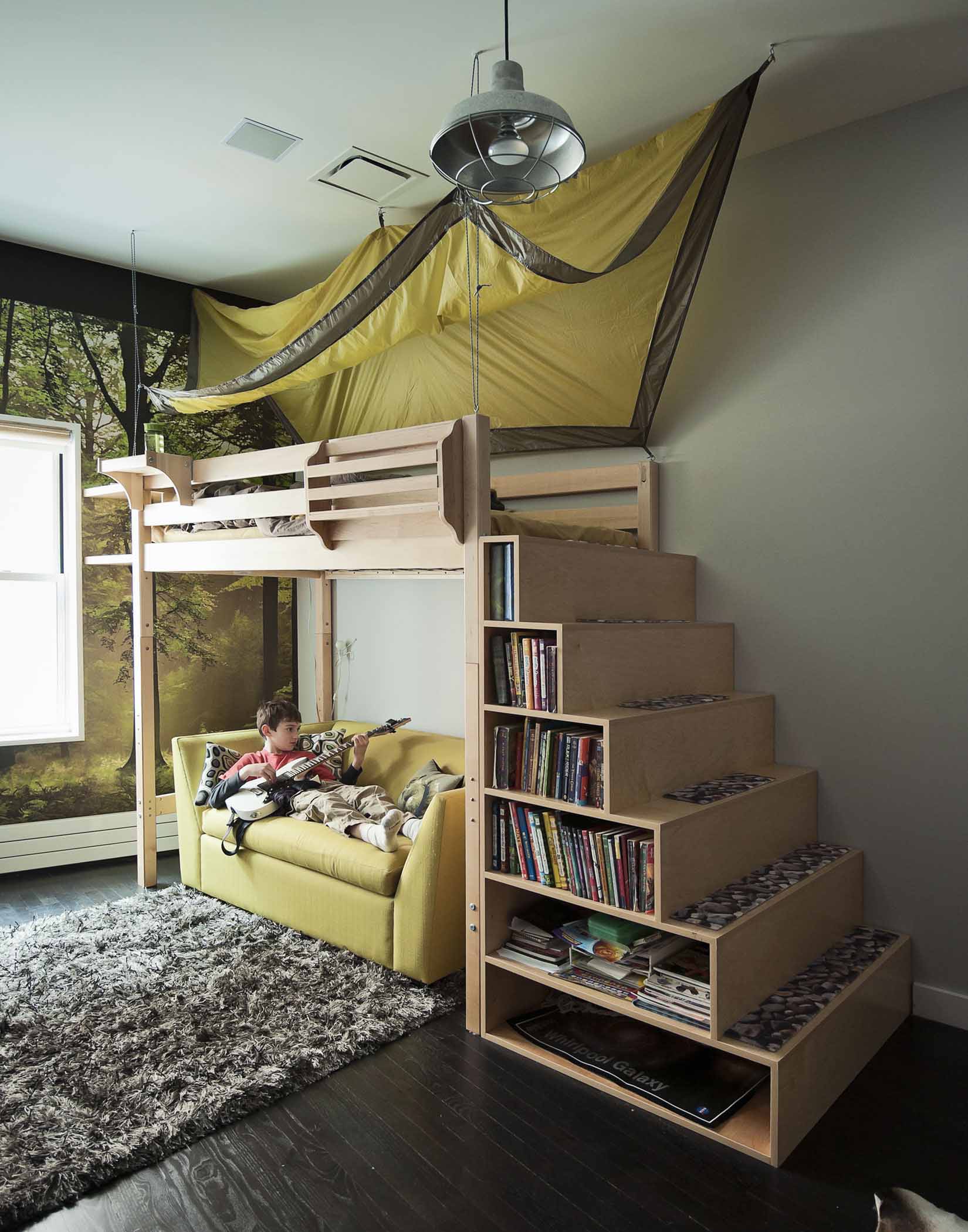 - Another interesting option is a storage room on the first floor of a bunk bed.You can organize it with glass panels or plasterboard walls.