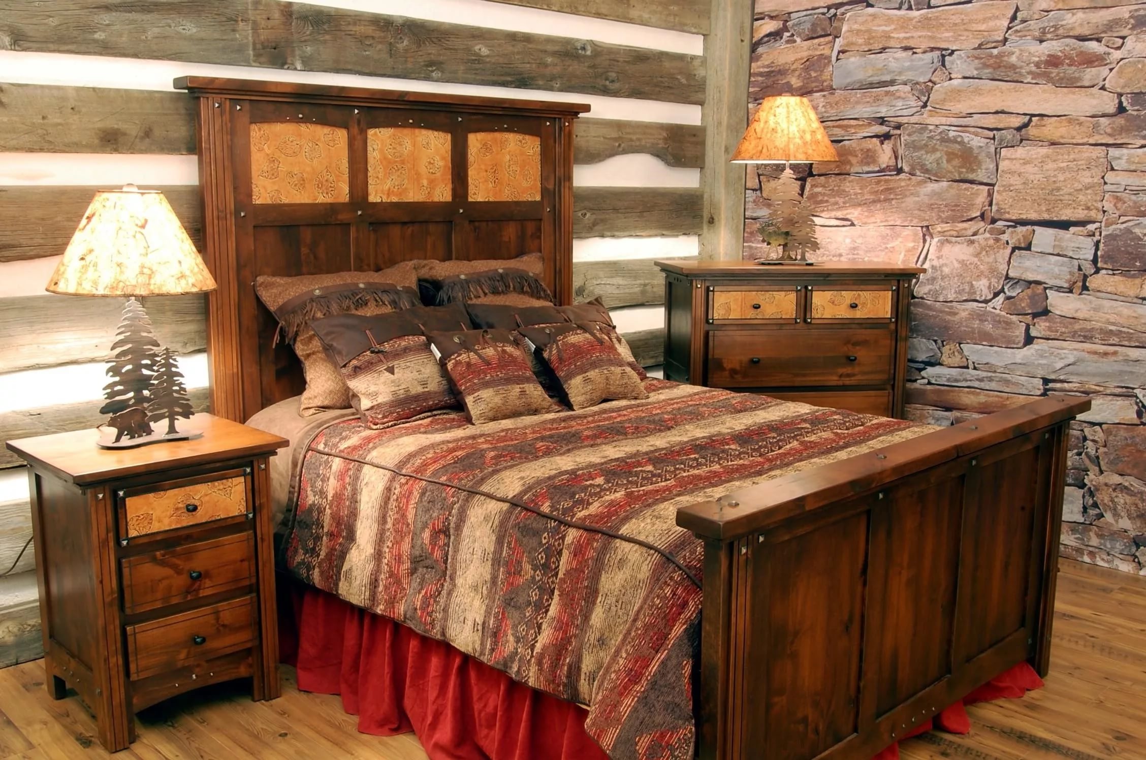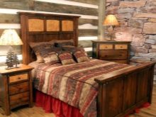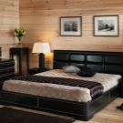 - Style Fans Country music prefer to use as a pedestal for a double bed planks, imitating rough and unpolished material. But even such a solution can look trendy. Such models are often decorated with textiles using “animal” prints, which further permeates the atmosphere with the spirit of the West.