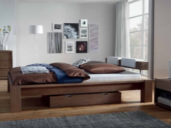 - Laconic style design Minimalism. The framework of such a product consists of a single rectangular wooden structure, this model is devoid of legs and high back. Sometimes wood is used as a pedestal for a mattress, and a small back at the head serves as a shelf for accessories.