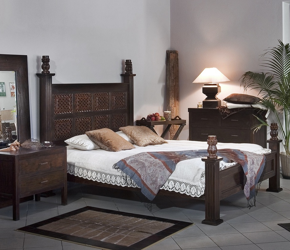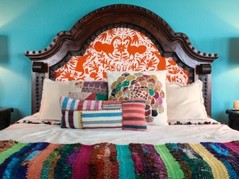 - No less peculiar ethnic design wooden bed.Here the emphasis is on pillows and bedspreads with an unusual ornament. Wooden statuettes on the shelves and bedside tables of the room will be a wonderful echo of the design.
