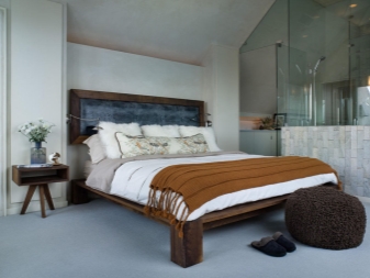 - Do not forget to choose bed linen depending on the color of the product frame. You can emphasize the depth of the shades of natural wood and at the same time create a bed in a very original way.