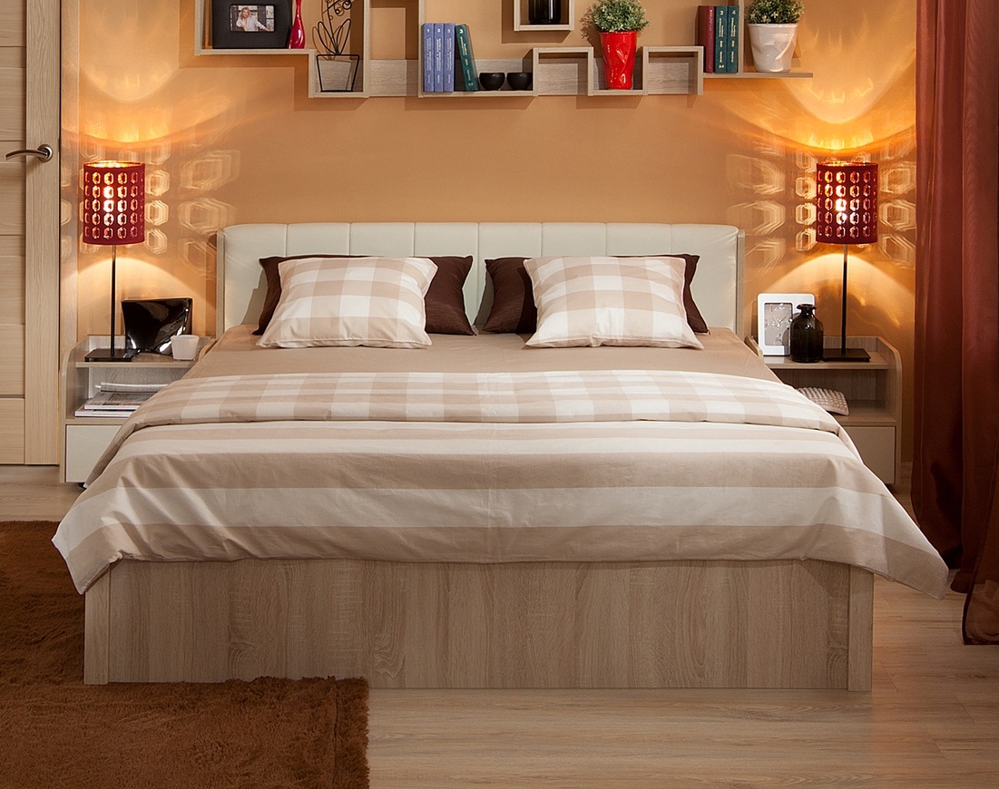 For those who are fundamentally important product strength, more expensive fit models of solid woodFor example, oak.Such material possesses high wear resistance, gives solidity to your bedroom. Modern design options allow you to embody oak models in various colors, which will allow you to perfectly combine the bed with the rest of the bedroom set. Coniferous varieties have excellent characteristics, they are especially recommended for those who decided to make a double bed on their own.