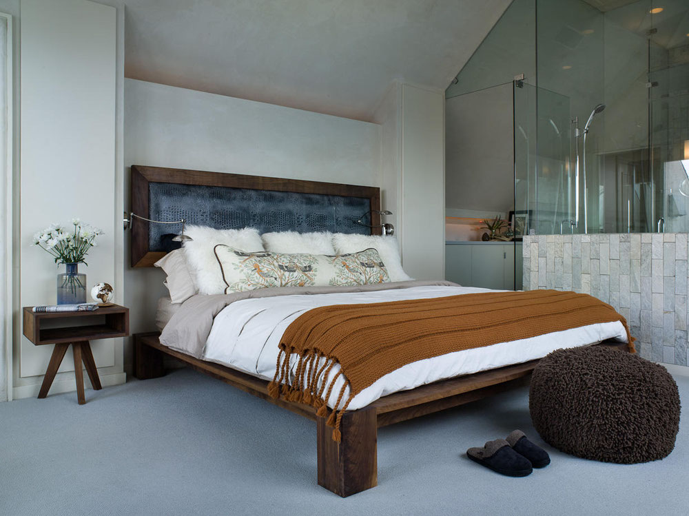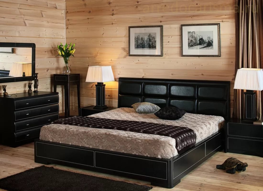 - An ageless option is considered a bed, the frame which represents single rectangular shape without legs and slim backtight to the wall. This option can be designed and interpreted according to individual tastes. Geometric ornament, which is embodied in the form of carving on the headboard and is repeated in some other interior details, is very popular.
