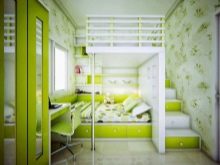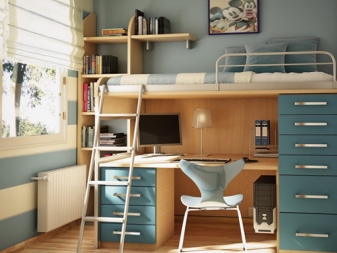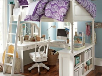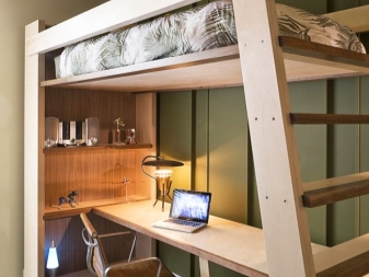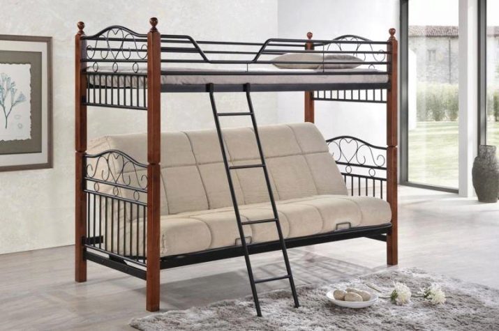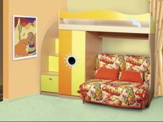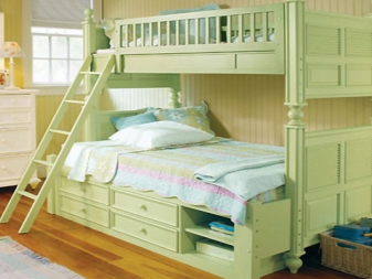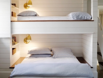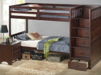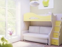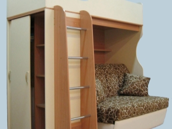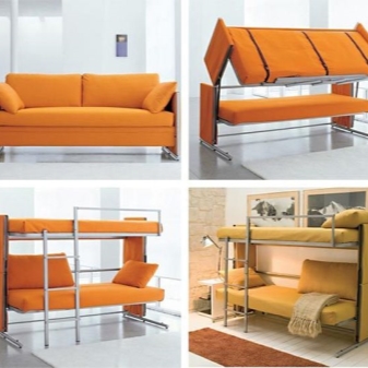A feature of such furniture is also considered the fact that the second tier is always represented by a single bed, but at the bottom there can be a double bed or a sofa or the same single bed. Sometimes a comfortable and wide armchair with a small table can be placed at the bottom of such a bed.