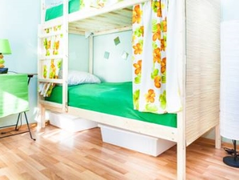 And the last feature is that if the bed is double with a full double bottom bed, then it is often realized together with curtains that are attached to the top of the whole structure. Thus, a miniature bedroom quickly and reliably, and most importantly, beautifully hidden from prying eyes.