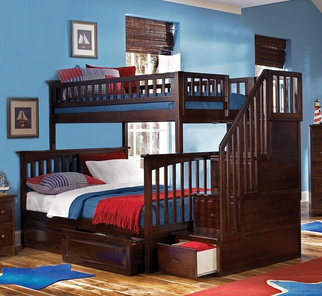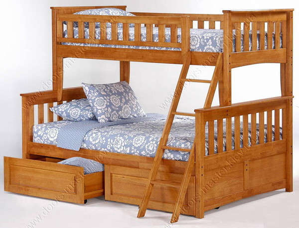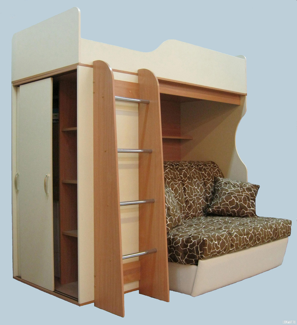 - No less suitable will be such varieties of furniture as this. Such furniture does not take up much space, but at the same time, thanks to the built-in linen drawers, it allows you to get additional space to store various things. The second berth at the top can be used for a child.