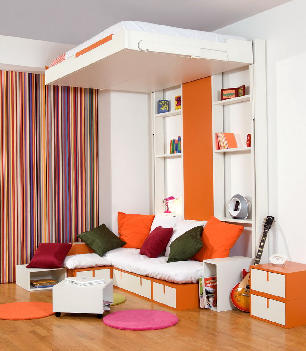 - Absolutely non-standard version of this furniture, but extremely stylish and comfortable. The bed here is located under the ceiling, but if necessary it can be quite easily lowered to the desired height and securely fixed. On the lower tier is a compact and comfortable sofa corner, so there will be no problems with the location, who came to visit friends. And if necessary, a sofa can be used as a place to sleep.