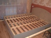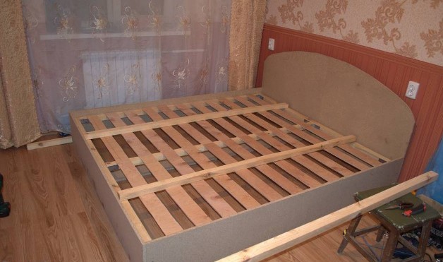 It is necessary to draw out and cut a chipboard sheet as follows: cut a partition 20 cm high and install it between the pre-assembled bed frame. To make an orthopedic base of plywood (instead of it you can take a sheet of solid birch): the lamella thickness should not exceed 20 mm, width - about 7-8 cm. All lamellae should be the same size.