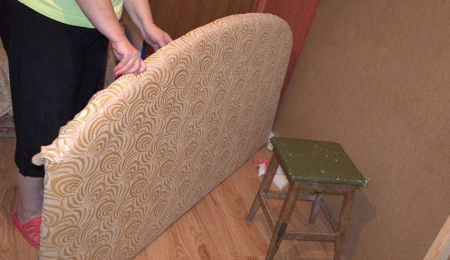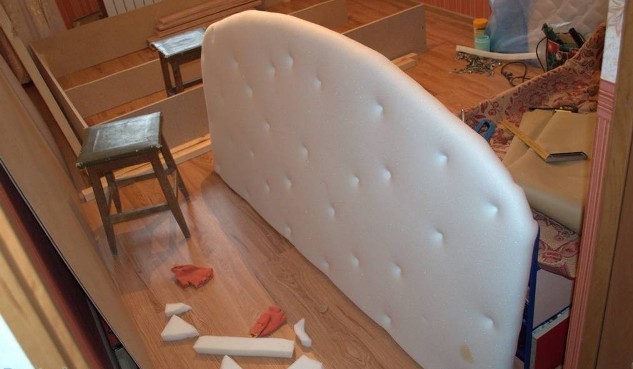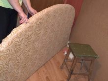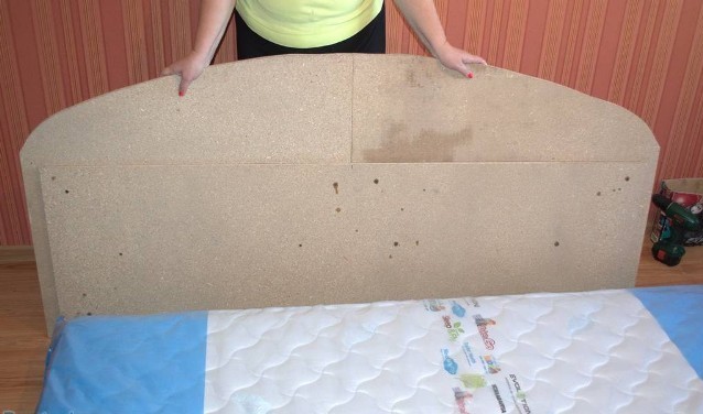The frame and the head of the bed are covered with foam rubber, then - only use the head of the bed with textile upholstery. Mark the frame of the lifting mechanism on the frame (4-6 bolts for each side). Cover the bed frame with fabric and attach the “lifts” that connect the box and the orthopedic base. Tighten the slats to the latter (this step can be done before, however, then the work on installing the gas lift will be more difficult). Connect the frame of the bed with the backrest, put sheets of plywood on the bottom (floor).