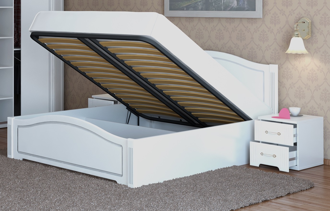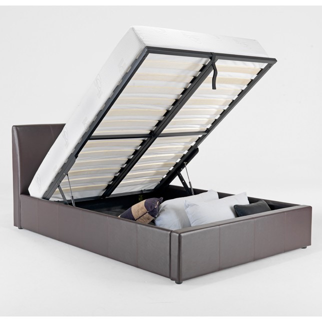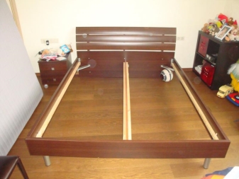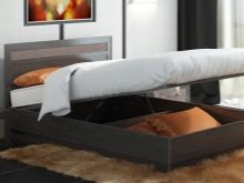 Ikea has a double bed with a "lift" - model "Malm" in three colors. The bed frame is made of chipboard, the bottom slats are made of birch and beech veneer, the bottom itself is metallic (like all similar beds).