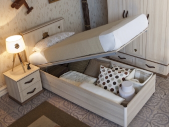 The bed can be wooden: solid wood, chipboard or chipboard, veneered or upholstered textile upholstery (leather, leather, velor, any furniture fabric). Soft beds are very practical and ideal for a classic interior, while “hard” models are well combined with modern and high-tech. Just do not confuse the "lifts" with the transformers that are "cleaned" in the wall niche and do not have a hint of a storage box. Children's beds with a lifting mechanism can be angular: something like an ottoman with a soft back or normal, have a soft back or be completely wooden.