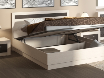 The most common models of beds with a lifting mechanism - wooden and leather.