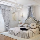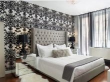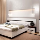- In a narrow room it is also possible to position the bed, for example, near the wall or across the bedroom. This is done for a visual increase in space and a convenient approach to the bed.