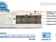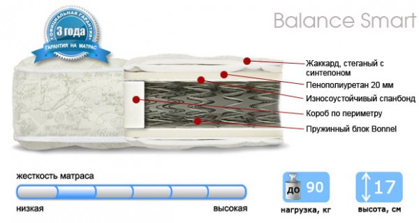 - Balance Smart - a thin mattress with a low level of rigidity, one-sided, maximum load - 89 kg. Has a jacquard cover. Spring block - Bonnel system.